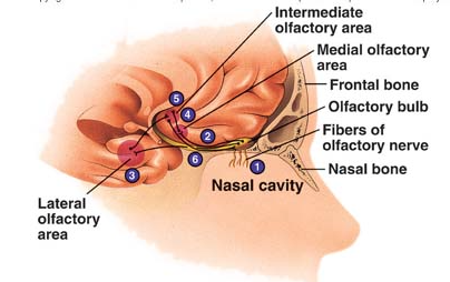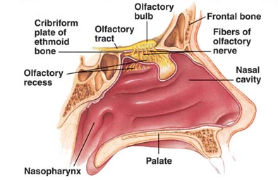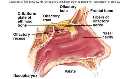 B)cribiform plate, olfactory bulb