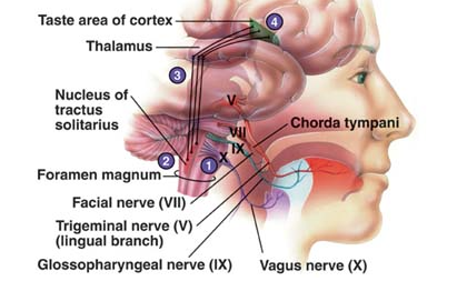 Feedback: The nerves carrying taste sensation enter into the medulla oblongata where they decussate and extend to the thalamus. From the thalamus the neurons project to the postcentral gyrus of the parietal lobe.