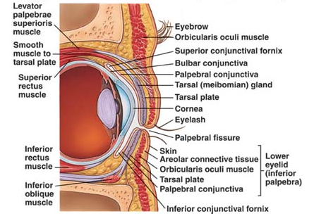 Two skeletal muscles control the eyelid: the levator palpebare superious which elevates the lid and the orbicularis oculi which closes the lid.