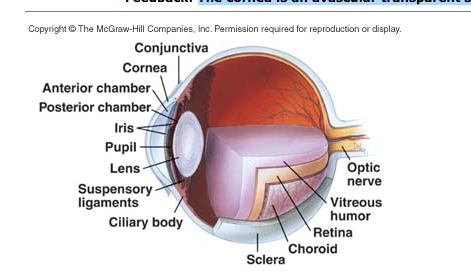 The cornea is an avascular transparent structure that covers the anterior of the eye.
