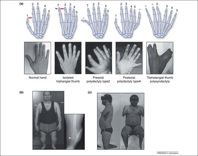 1.. Individuals are shown with hand defects consistent with abnormal Shh function. Discuss what kind of disruption of Shh expression/function may have occurred in each of the four cases shown and what other disorders you may want to screen for in each of these individuals.