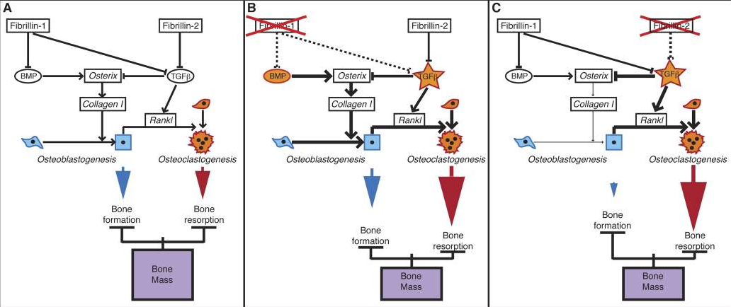 The most likely interpretation of the effect of Fibrillin-1 defects is an imbalance favoring bone decreased bone mass (see below). This would be consistent some (but not all) aspects of the Marfan phenotype. The balance of bone growth to clearly changes over the life span—with Marfan patients showing increasingly fragile bones as they age. Interestingly, the most medically critical aspect of this syndrome has to do with the structural role of Fibrillin 1 in the assembly of elastin fibers. Marfan patients have enlarged aortae, due to a weak vascular wall, and are at increased risk for aortic rupture.