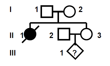II-1 is affected, therefore I-1 and I-2 are obligate heterozygotes. What is the chance of their daughter being a carrier (remember, the disease is fatal in childhood, so she cannot be a homozygote): 2/3 (see Pannett square below)