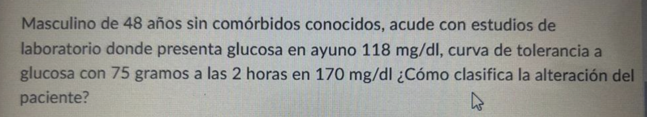 femenino de 20 años presenta glucosa en ayuno de 105 mg/dl, curva de tolerancia a la glucosa 75 gr a las 2 horas 160 mg/dl, dx?