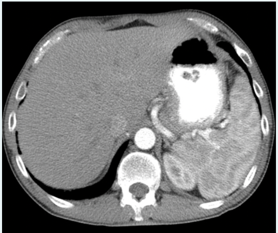 In what phase of tissue enhancement is the intravenous iodinated contrast in the image below?