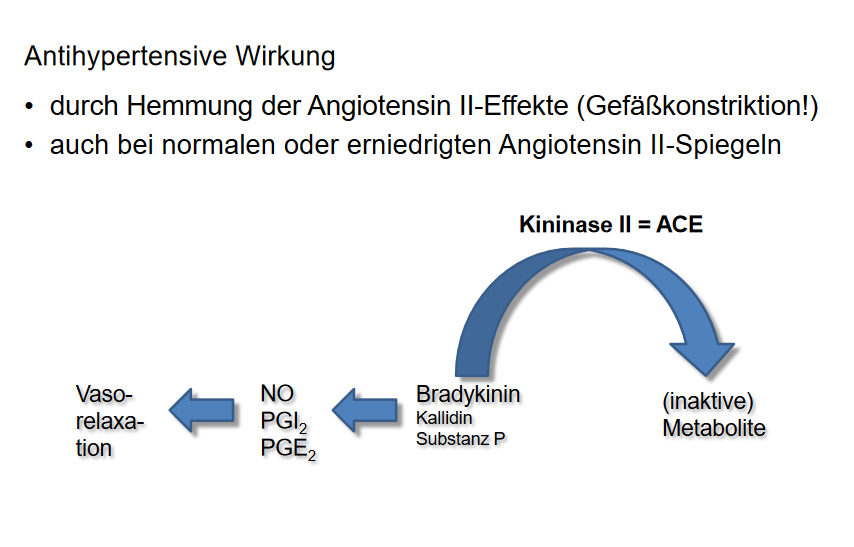 Mehr Bradykinin = vermehrte Bildung vasodilatatorischer Substazen (NO und Prostazyklin)