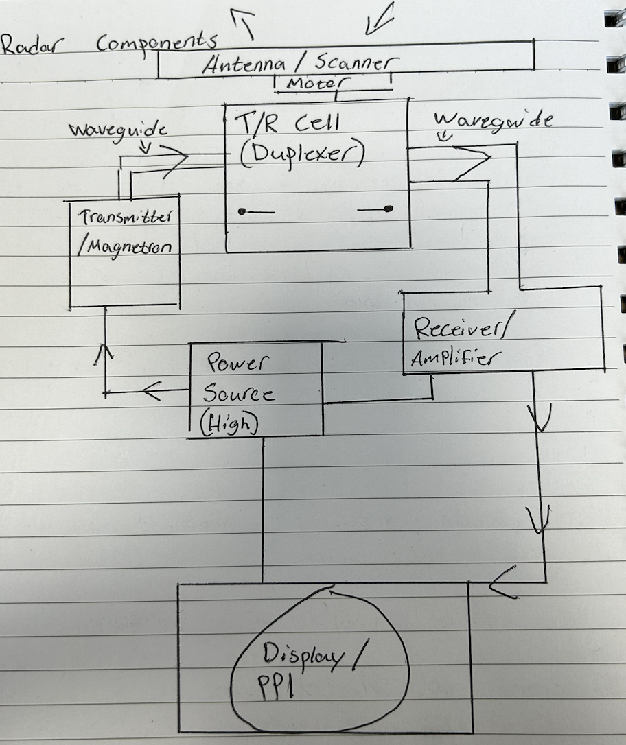 Power source, Transmitter (magnetron), T/R Cell (duplexer), Antenna (Scanner) (Also a motor to drive the antenna), Receiver/Amplifier, Display/PPI (Plan position indicator)