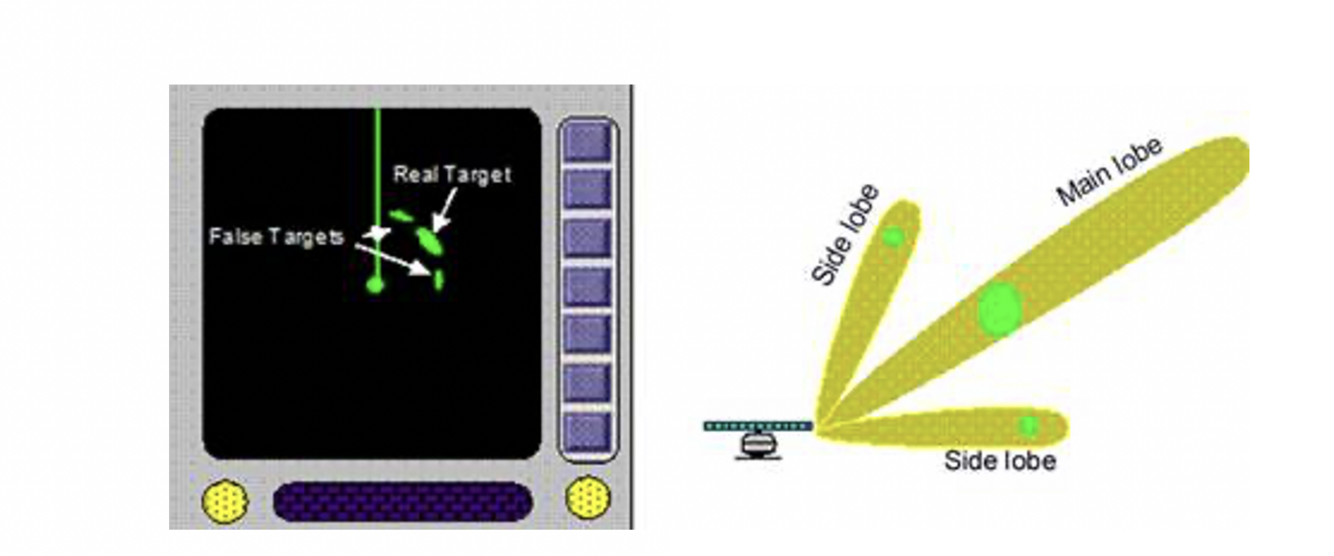 Side Lobes extending from the main beam catch targets close by, displaying them at the same range, extending out from the main target