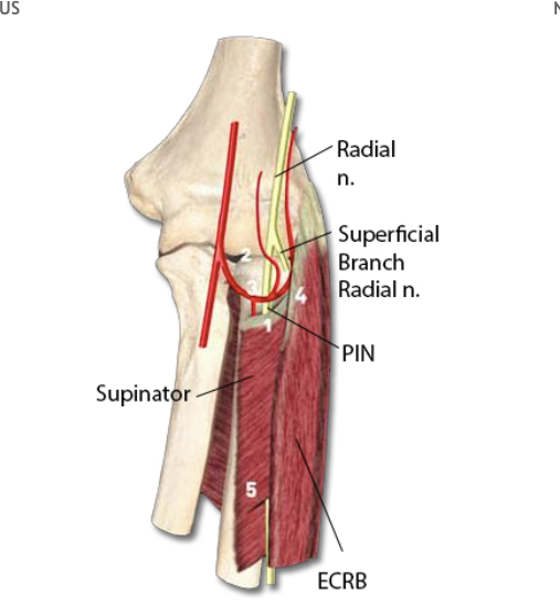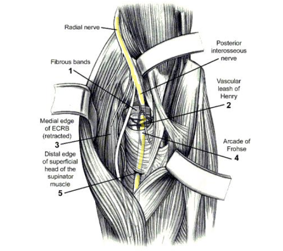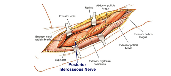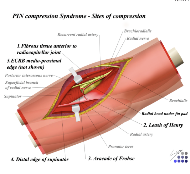 Compressive neuropathy of PIN effective the muscular supply of the forearm EXTENSOR compartment