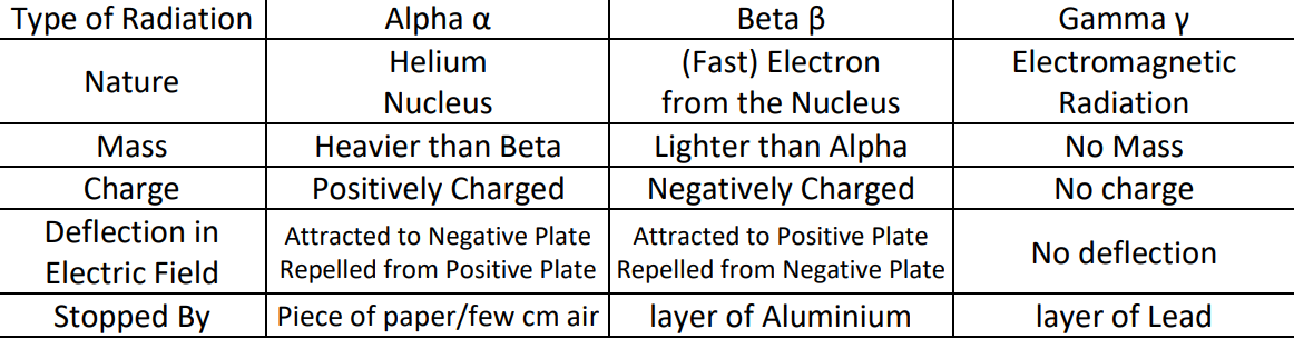Type of radiation, the range, the ionising power and the material that prevents penetration?
