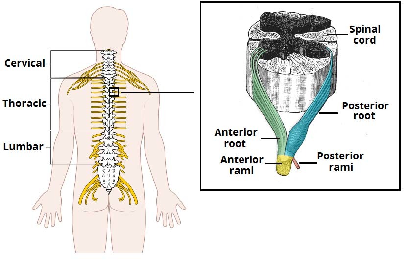 A radiculopathy is a conduction block in the axons of a spinal nerve or its roots, with impact on motor axons causing weakness and on sensory axons causing paraesthesia and/or anaesthesia.