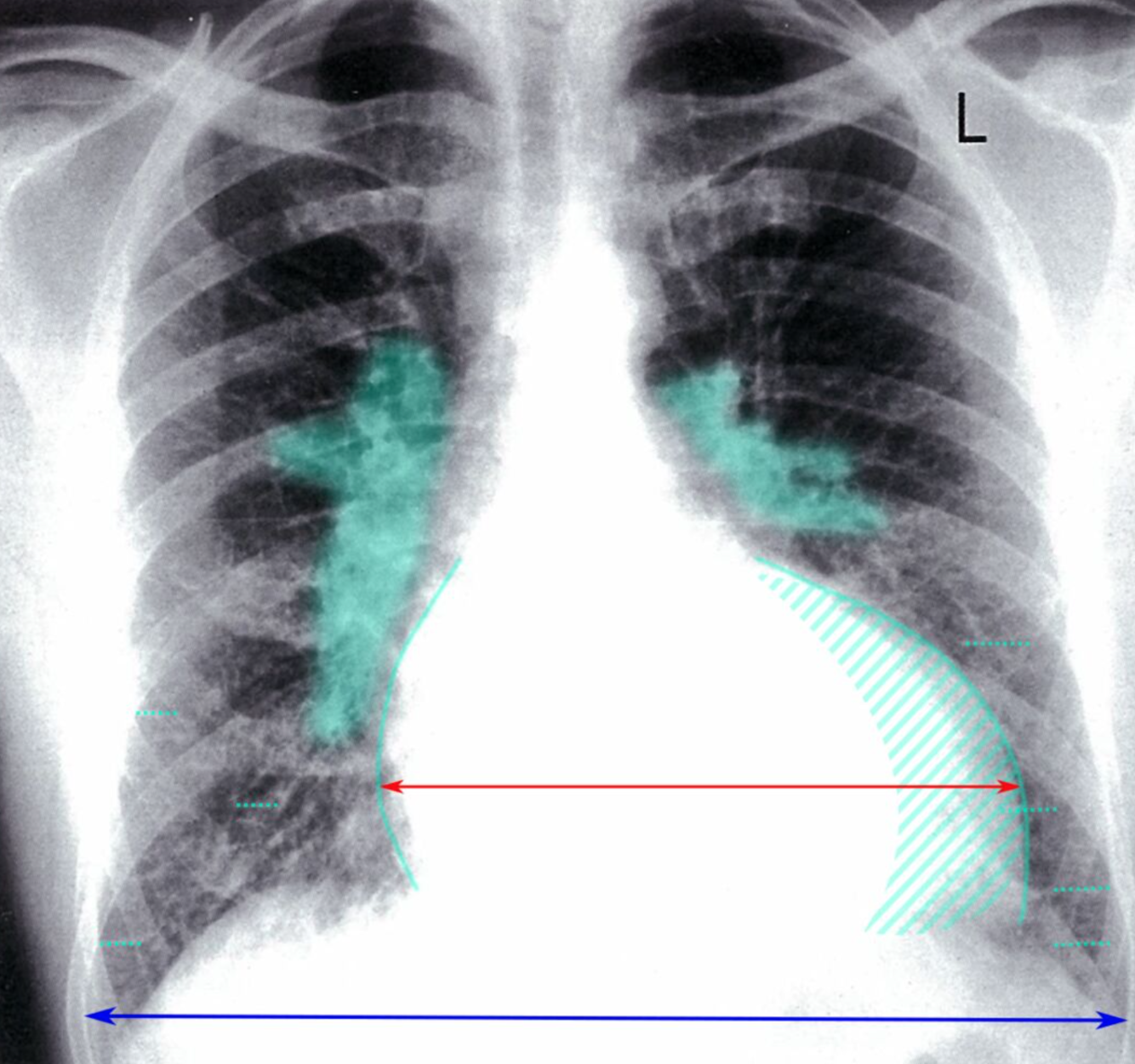 The cardiac silhouette is enlarged (hatched green overlay), with an increased cardiothoracic ratio > 0.50 (red line:blue line). Prominent central pulmonary vessels (green overlay) reflect vascular redistribution. Interlobular septal thickening (Kerley B lines) is seen in the lower zones (examples indicated by dotted green lines)