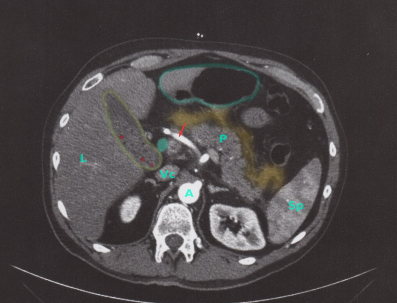 Un échouage graisseux et fascial (superposition jaune) antérieur au pancréas (P) indique une inflammation péripancréatique. La vésicule biliaire (contour jaune) contient des calculs (exemples indiqués par une superposition rouge) et des boues. De plus, le canal cholédoque (overlay vert) est légèrement dilaté.