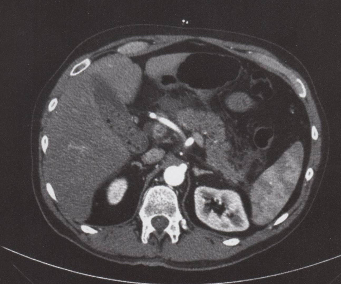 TDM de l’abdomen (avec contraste ; plan axial) d’un patient atteint de pancréatite biliaire aiguë