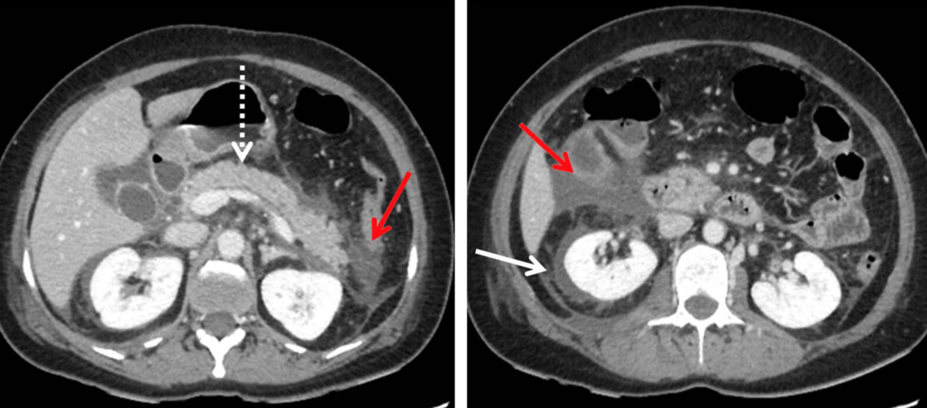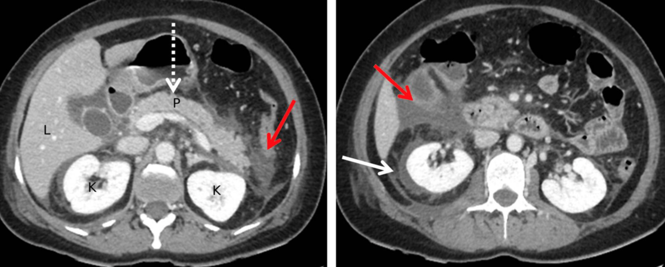 Une collection liquide péripancréatique aiguë homogène non encapsulée (APFC) sans composants solides est visible. L’aspect est caractéristique de la pancréatite interstitielle aiguë (non compliquée). Un échouage liquidien et graisseux peut être observé en avant du pancréas ainsi que dans les espaces pararénaux (flèches rouges). Il existe également du liquide périrénal (flèche blanche). Le tissu pancréatique (flèche en pointillés ; P) est rehaussé de manière homogène, sans signe de nécrose tissulaire.