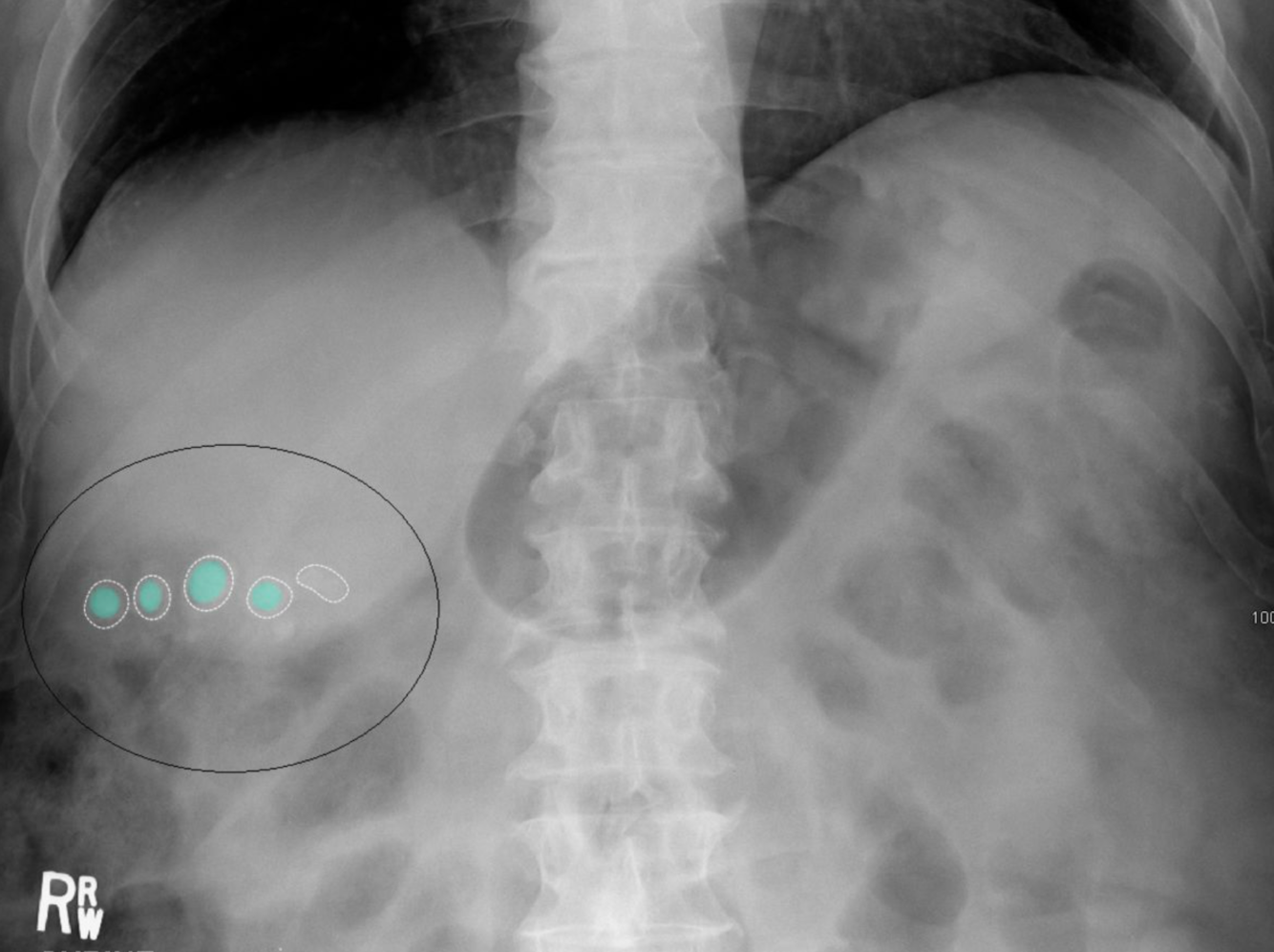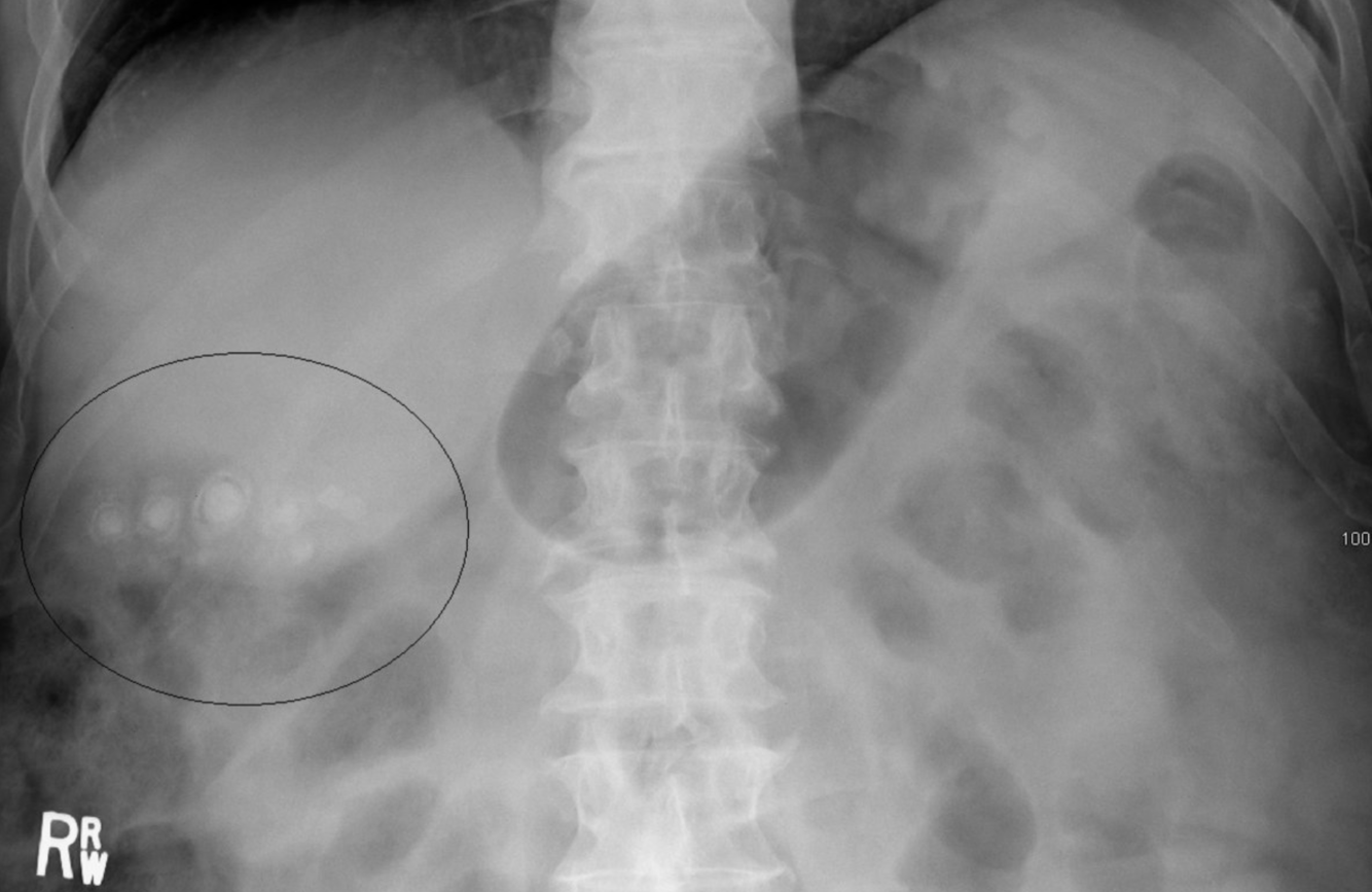 Les calculs de cholestérol pur, le type le plus courant de calculs biliaires, sont radiotransparents sur les radiographies abdominales. Le pigment noir et les calculs biliaires mixtes peuvent contenir suffisamment de calcium pour être radio-opaques.