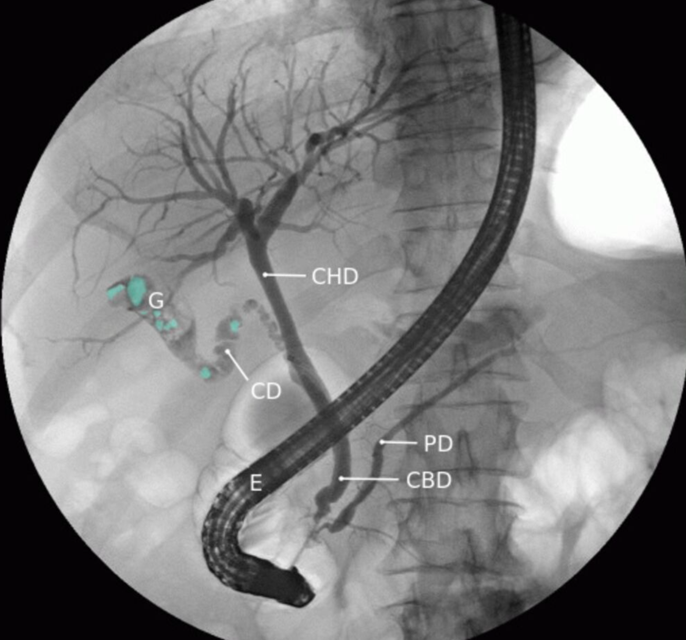 La pointe de l’endoscope (E) est située dans le duodénum au niveau de l’ampoule de Vater. L’amélioration du contraste permet de visualiser les voies biliaires hépatiques, les canaux hépatiques gauche et droit, le canal cystique (CD), la vésicule biliaire (G), le canal cholédoque (CBD) et le canal pancréatique (PD). Plusieurs défauts de remplissage (exemples indiqués par une superposition verte) peuvent être observés dans la vésicule biliaire et le canal cystique.