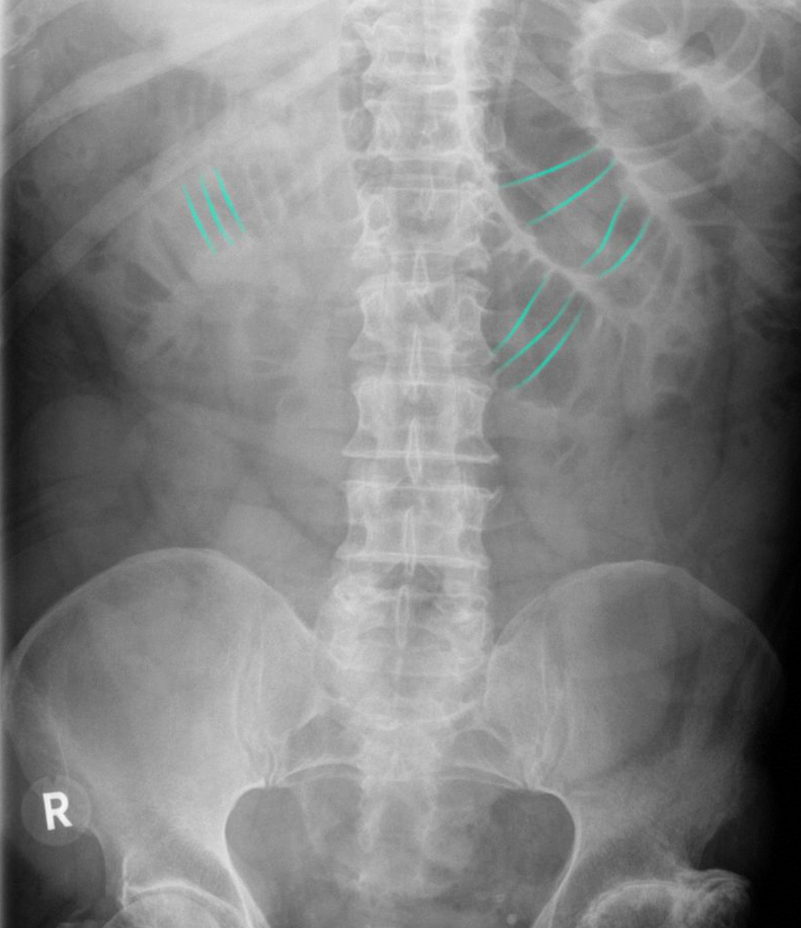 Multiple gas-filled, dilated (> 3 cm diameter) loops of bowel can be identified as small bowel loops by the presence of plicae circulares (green overlay).
