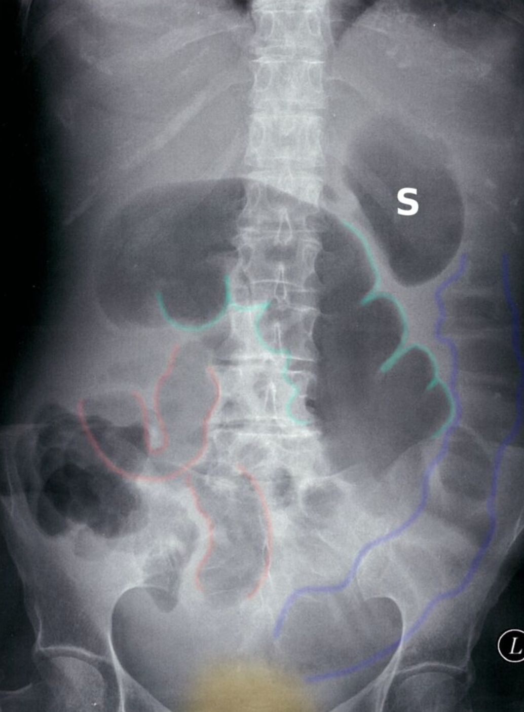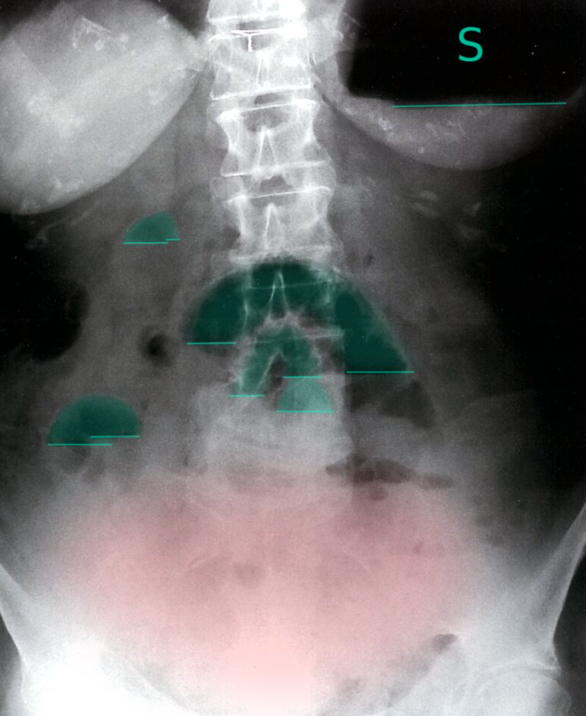 Multiple air-fluid levels (green overlay) are visible in the mid-abdomen. The opaque appearance of the pelvis (red overlay) is due to fluid-filled loops of small bowel. There is a paucity of gas in the colon, and an air-fluid level is present in the dilated stomach (S).