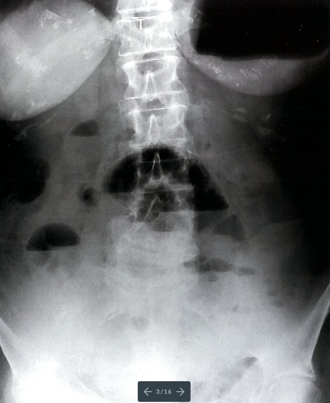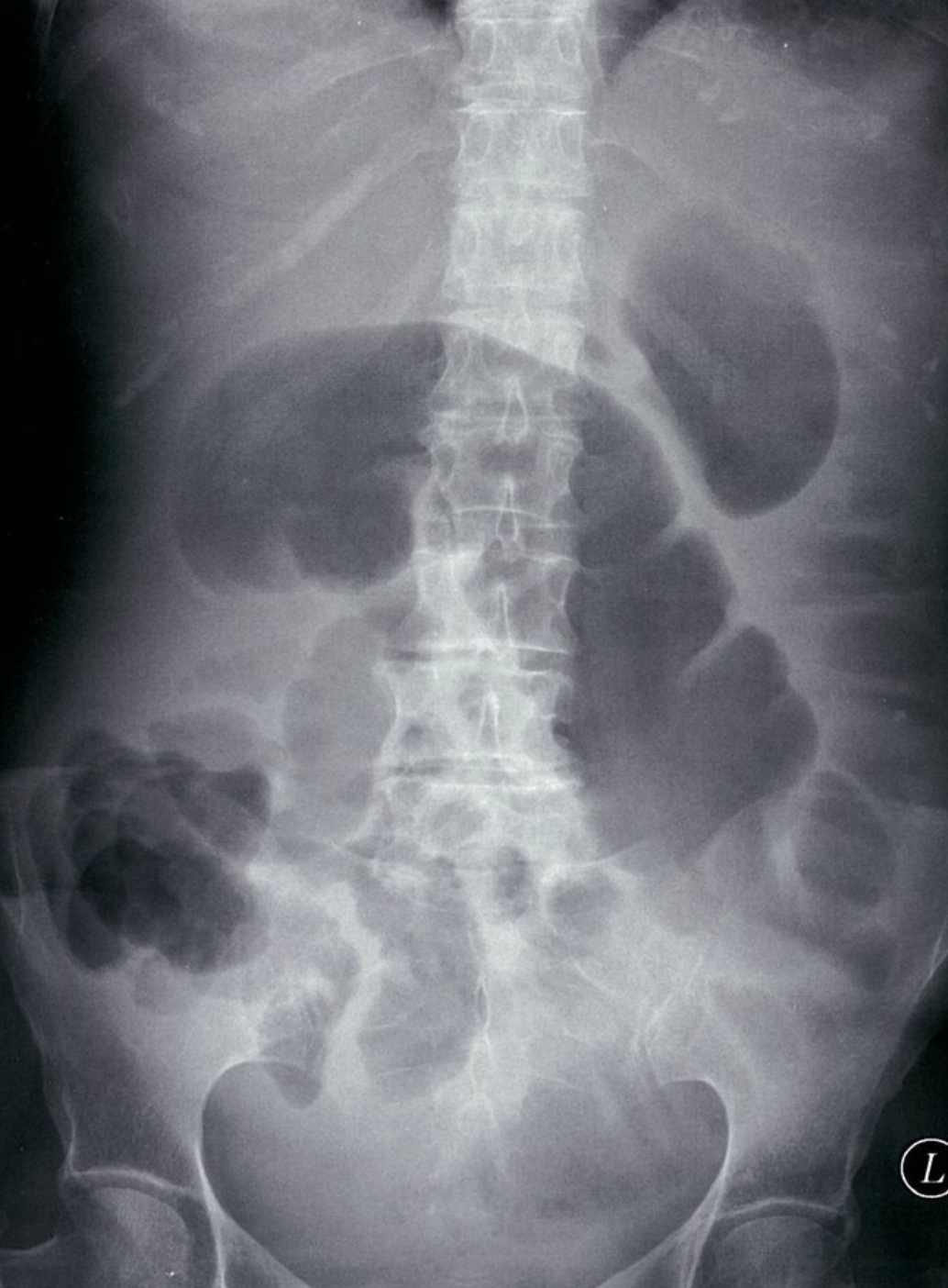 X-ray abdomen (AP view, supine) of a patient with distal small bowel obstruction