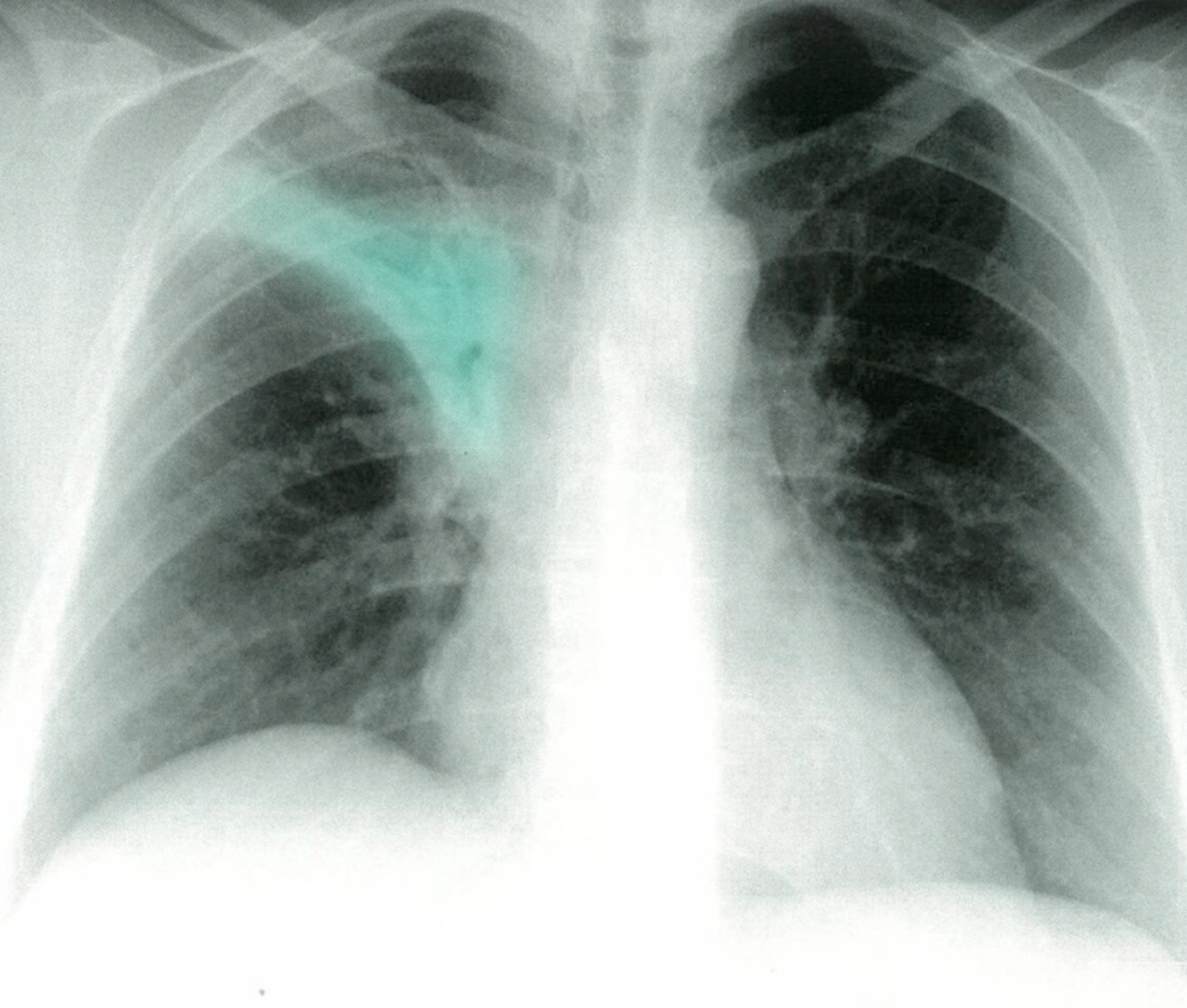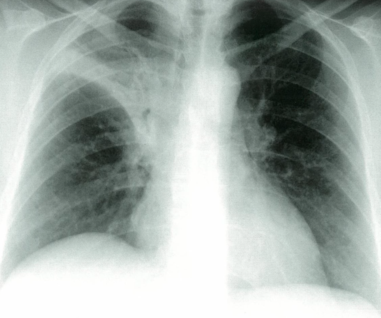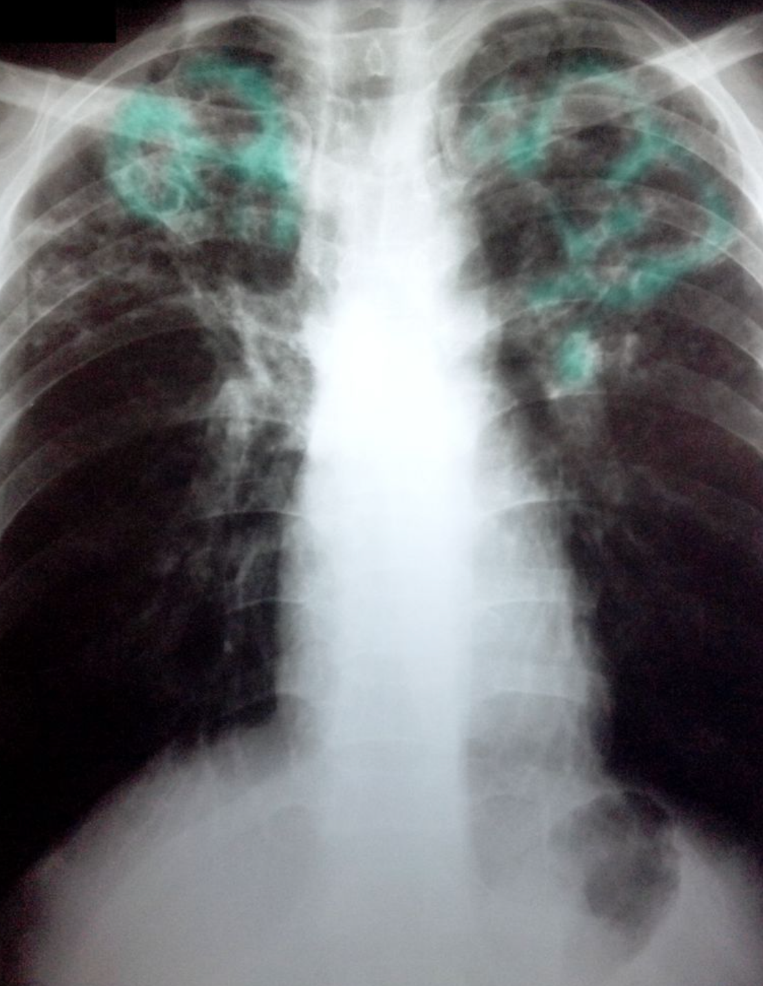 Posteroanterior chest x-ray showing bilateral apical, streaky parenchymal densities (green borders). These are most likely cavernous changes, which may occur during the course of post-primary tuberculosis. The full extent of cavernous formation can not be assessed on an x-ray; a CT scan should be performed.