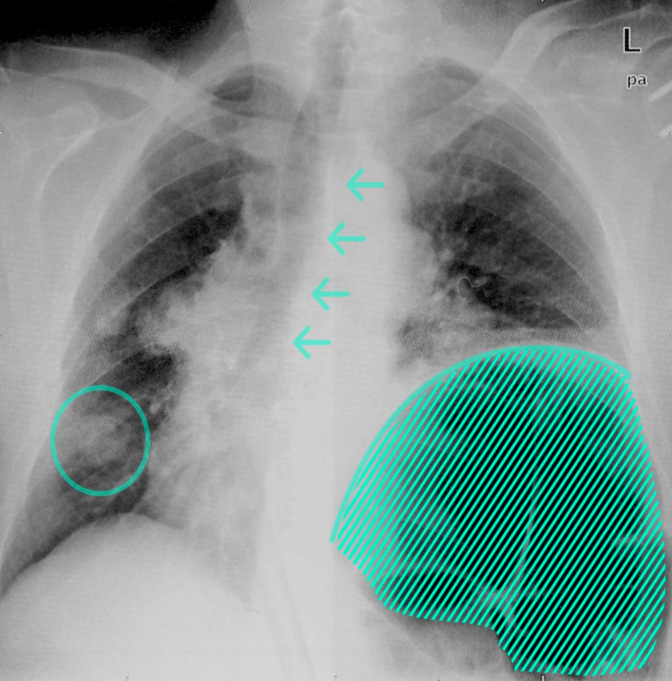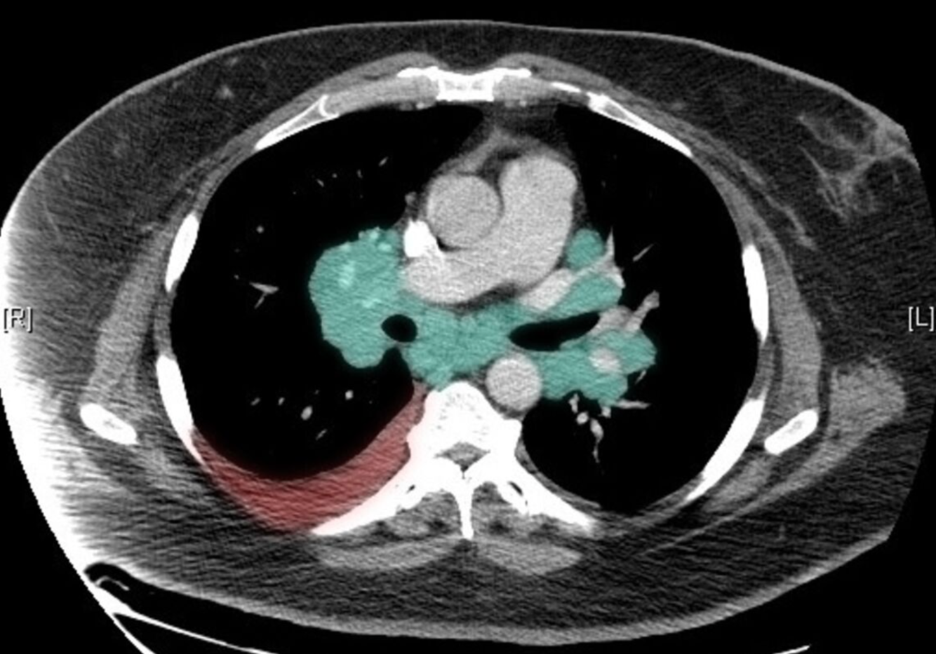 There is also evidence of right-sided pleural effusion (red overlay).