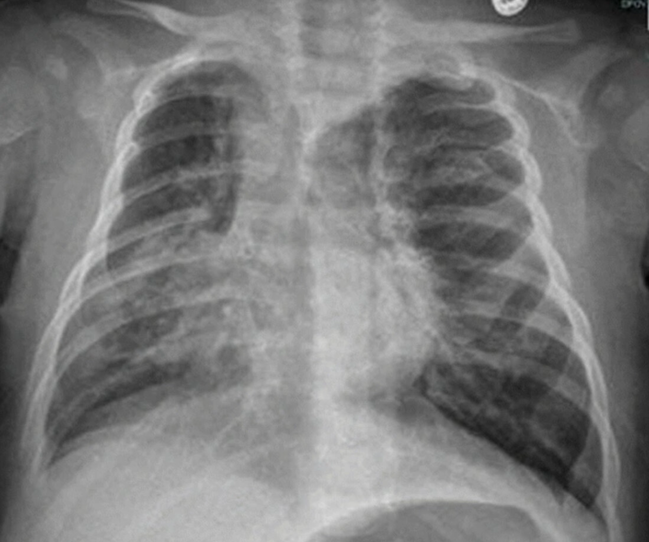 X-ray chest (AP view) of a child with viral bronchiolitis and focal pneumonia