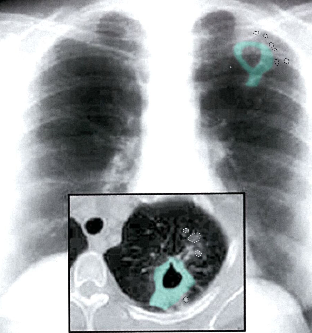 A thick-walled irregularly shaped cavity (green overlay) in the left lung apex is surrounded by micronodular opacities (examples indicated by dotted lines), which are better seen on the CT image than on the chest radiograph.