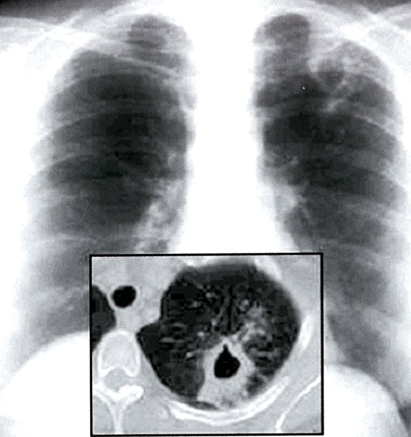 X-ray chest (PA view; insert: axial CT, lung window) of a patient with postprimary tuberculosis