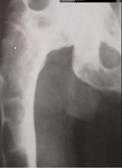 - C’est une lésion sclérotique géographique, petite ligne de transition (cortical bone in a medullary location)