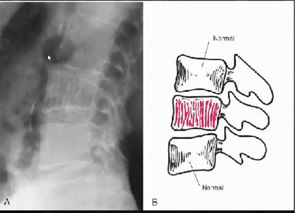 - DDX : Maladie de paget (mais dans ça, les contours vertébraux sont sclérotique (picture frame vertebrae).