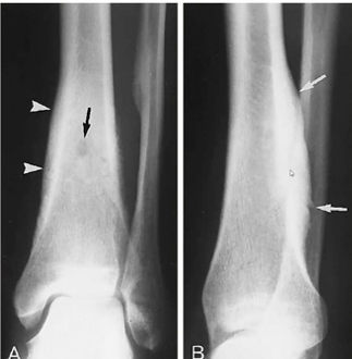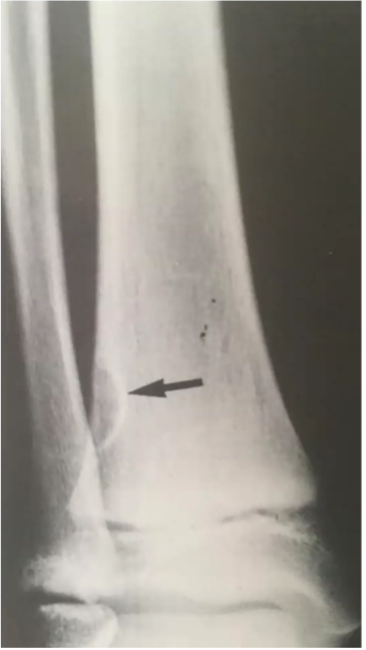 - Distal tibia ou os long, dans la métaphyse