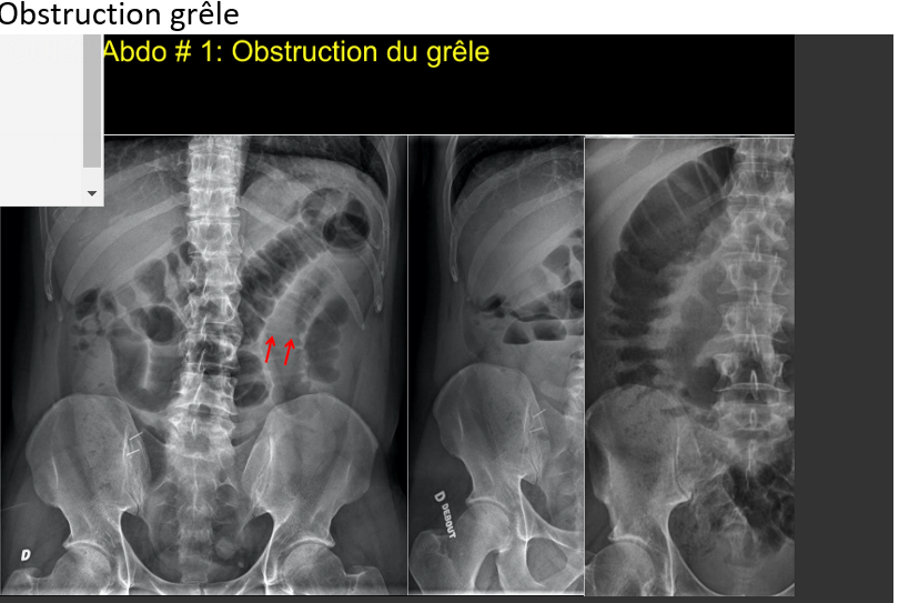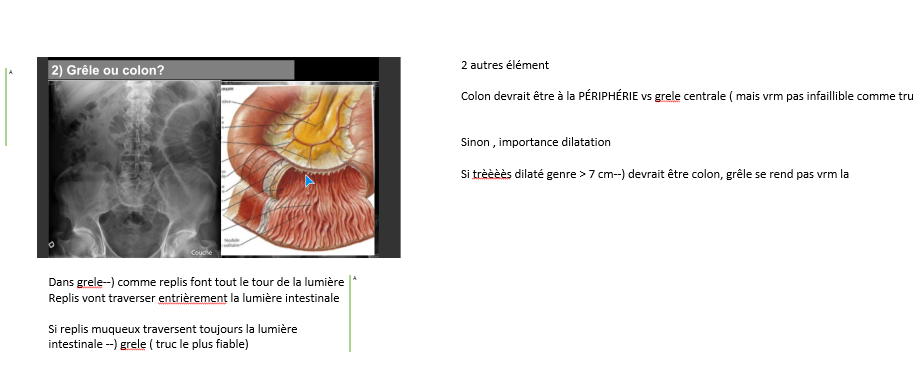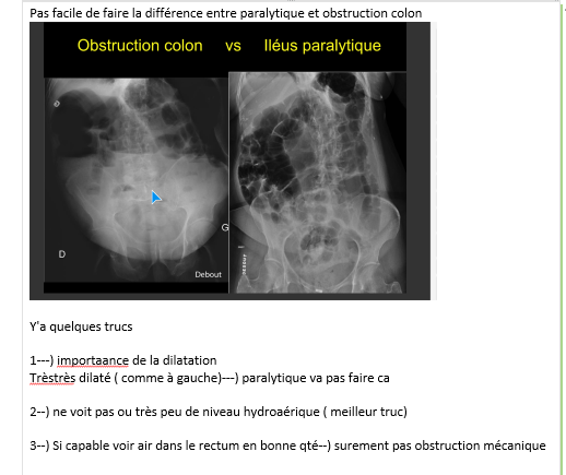donne 3 trucs pour différencier entre obstruction grele ou colon