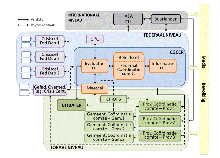 Leg de organisatie van het crisisbeheer in een nucleaire noodfase uit aan de hand van een schema