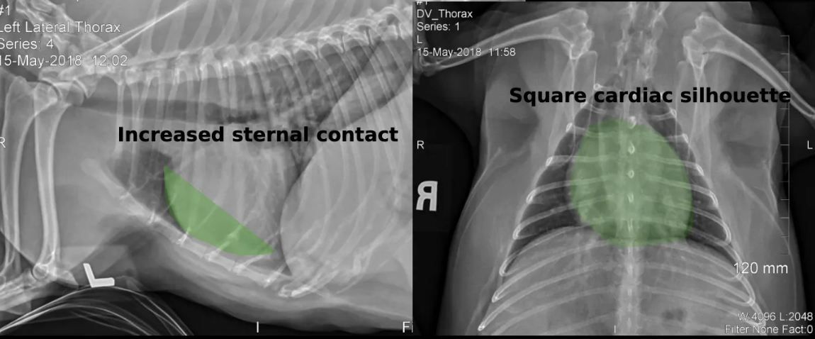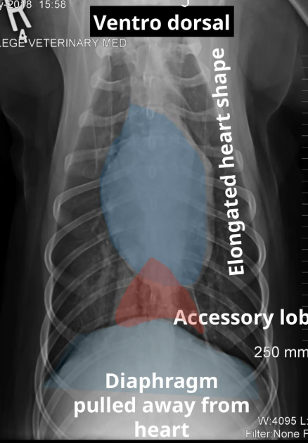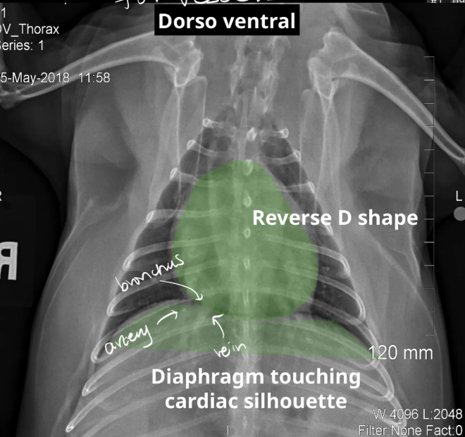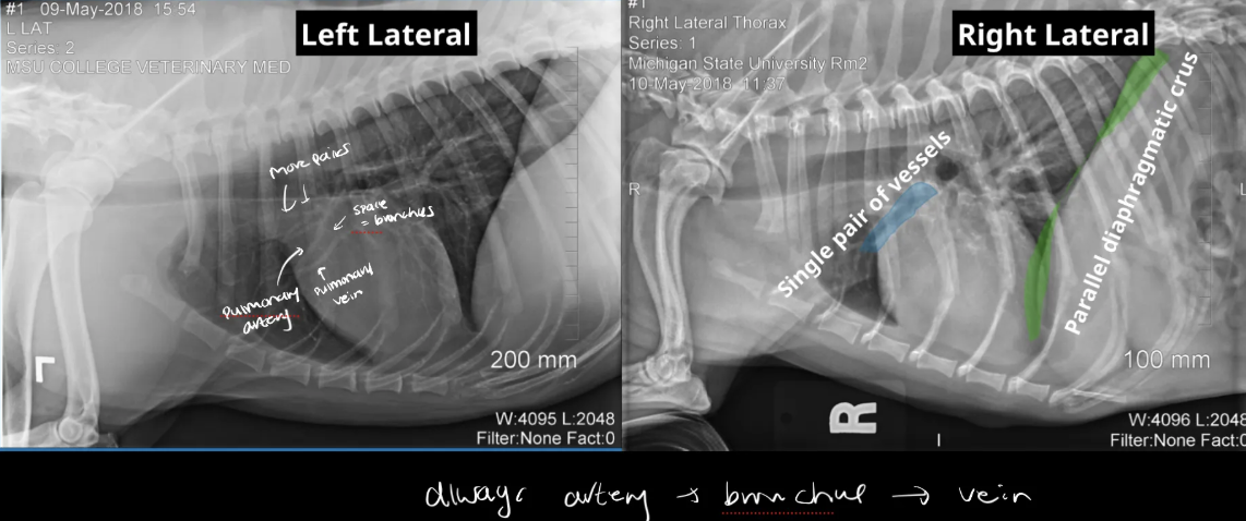 right lateral: parallel disphragmantic crus + only one cranial pulmonary vessels visible