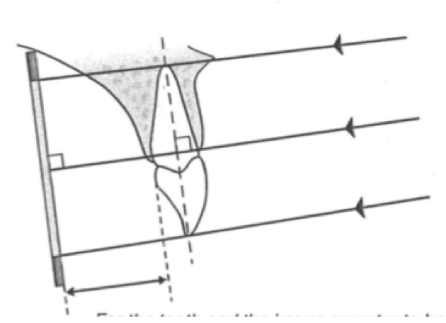The central ray is perpendicular to the long axis of the tooth.