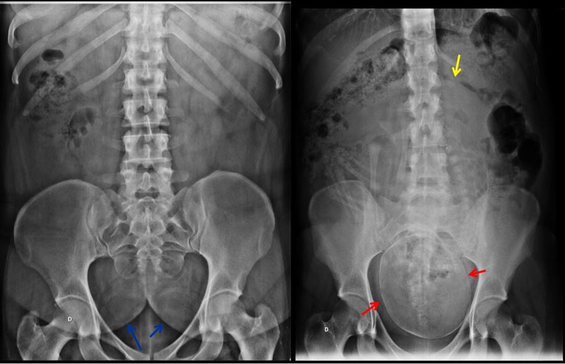 CÁLCULO CORALIFORME À ESQ E CÁLCULO URETERAL À DIREITA.