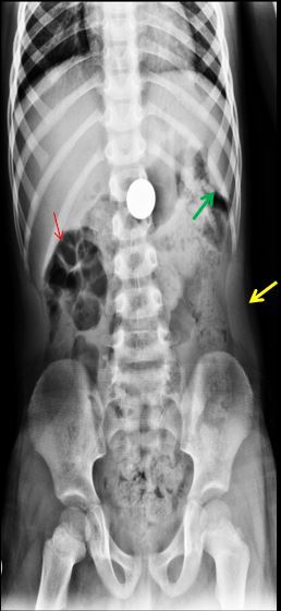 Quando ela se torna visível isto significa que existe ar no interior desta alça e patológico externamente ou seja na cavidade peritoneal. Isto indica Pneumoperitônio ( Sinal de Leo Riegler ) ou seja a parede intestinal normalmente invisível, se torna visível como uma faixa densa.