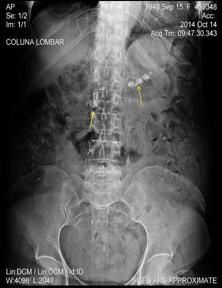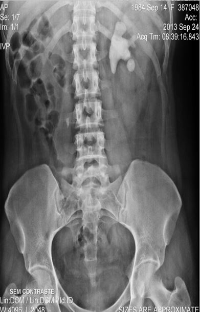 IMAGEM CÁLCICA VOLUMOSA NO HIPOCÔNDRIO ESQUERDO MOLDANDO PELVE E CÁLICES. HÁ OUTRA IMAGEM CÁLCICA À DIREITA EM PROJEÇÃO URETERAL ( NÍVEL DE L3)