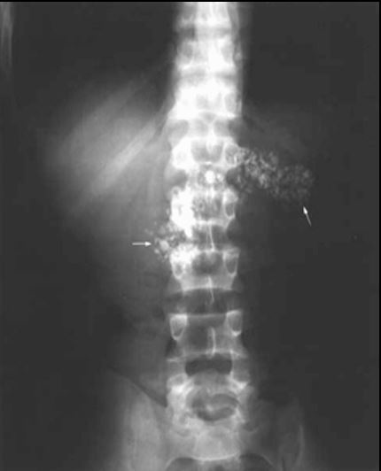 HÁ INCONTÁVEIS IMAGENS CÁLCICAS NA REGIÃO EPIGÁSTRICA CONFIGURANDO O FORMATO DO PÂNCREAS ( NIVEL DE T12,L1 E L2)