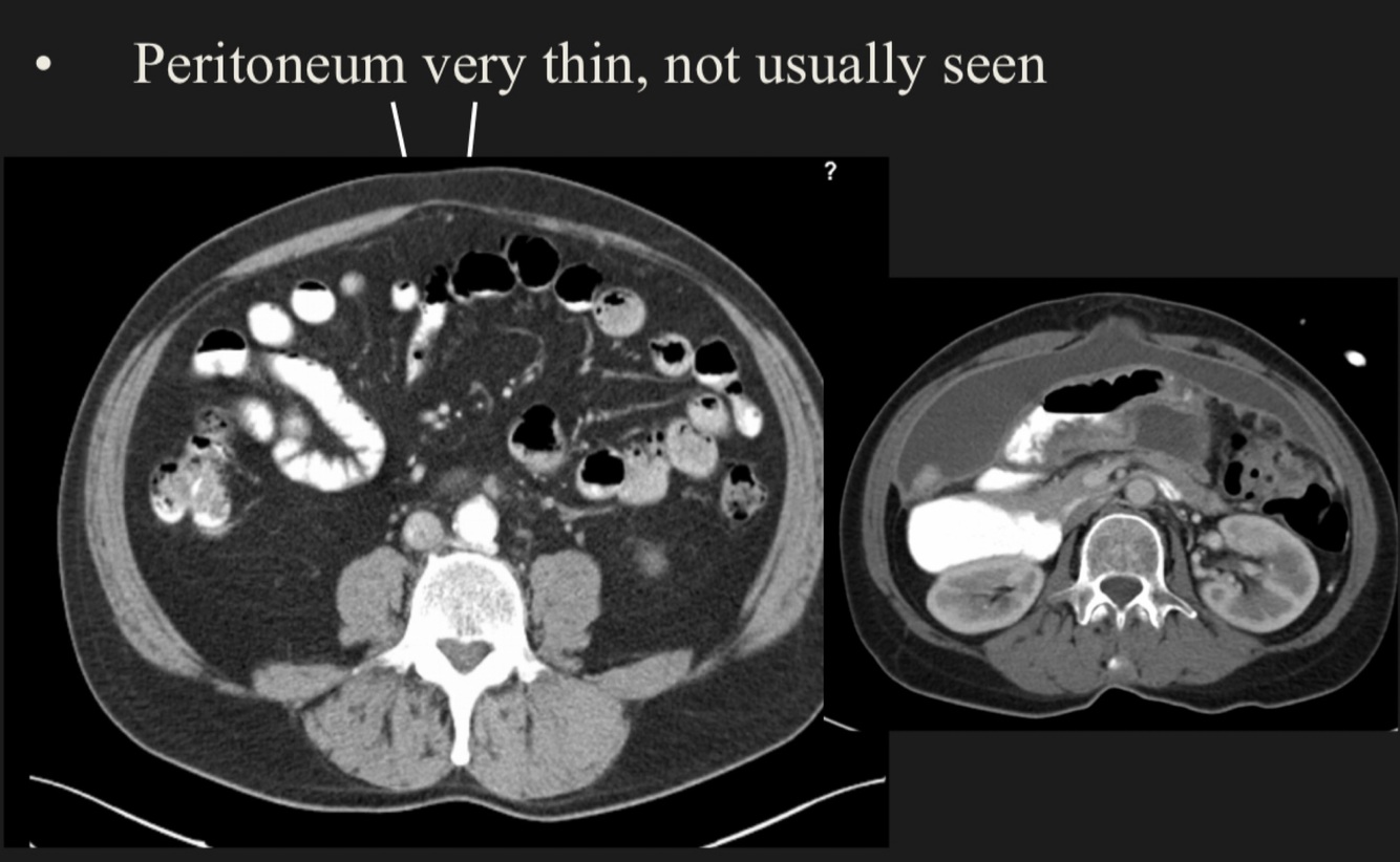 Can the peritoneum be seen in radiological techniques?