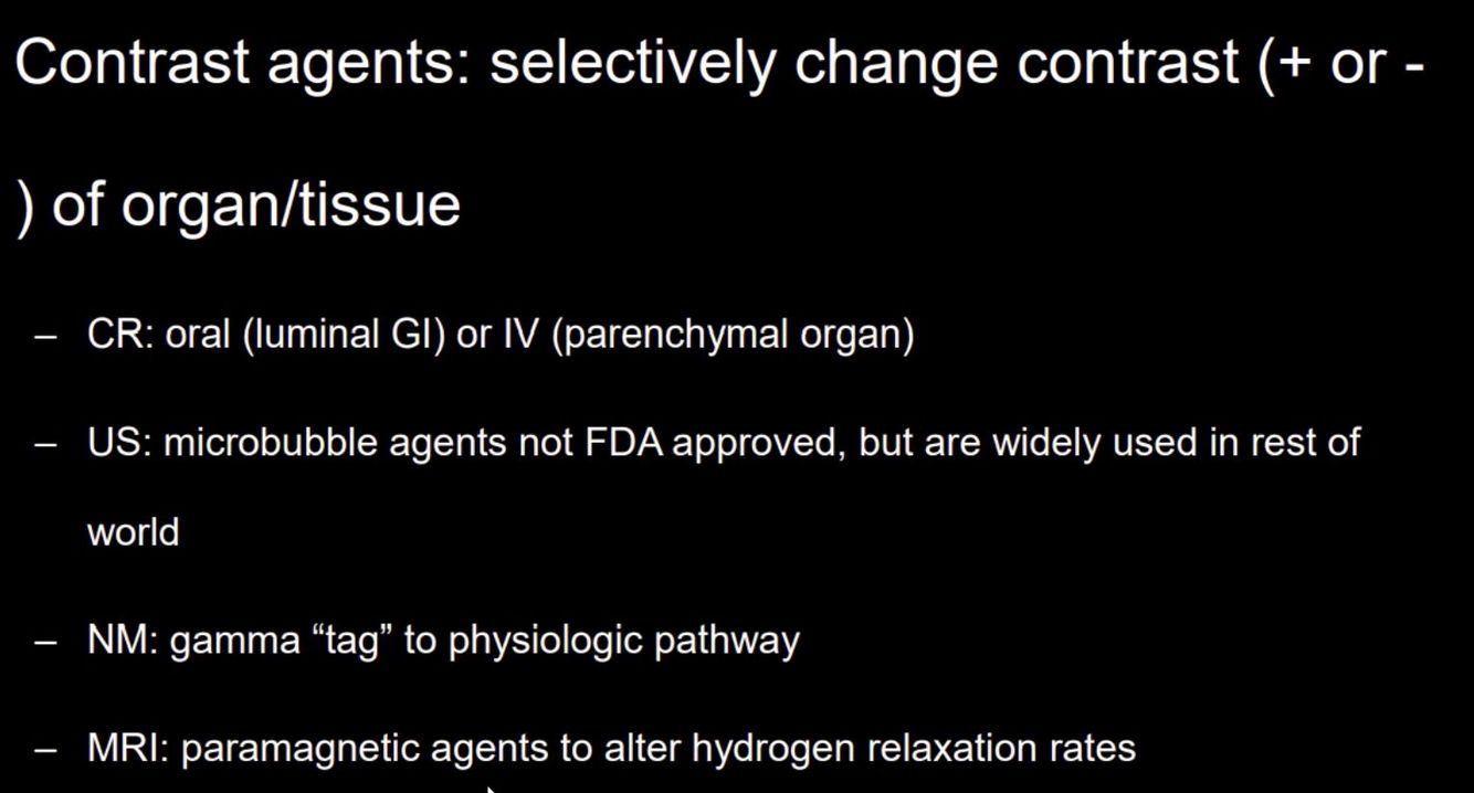 Contrast agents in CT, ultrasound, MRI, nuclear medicine