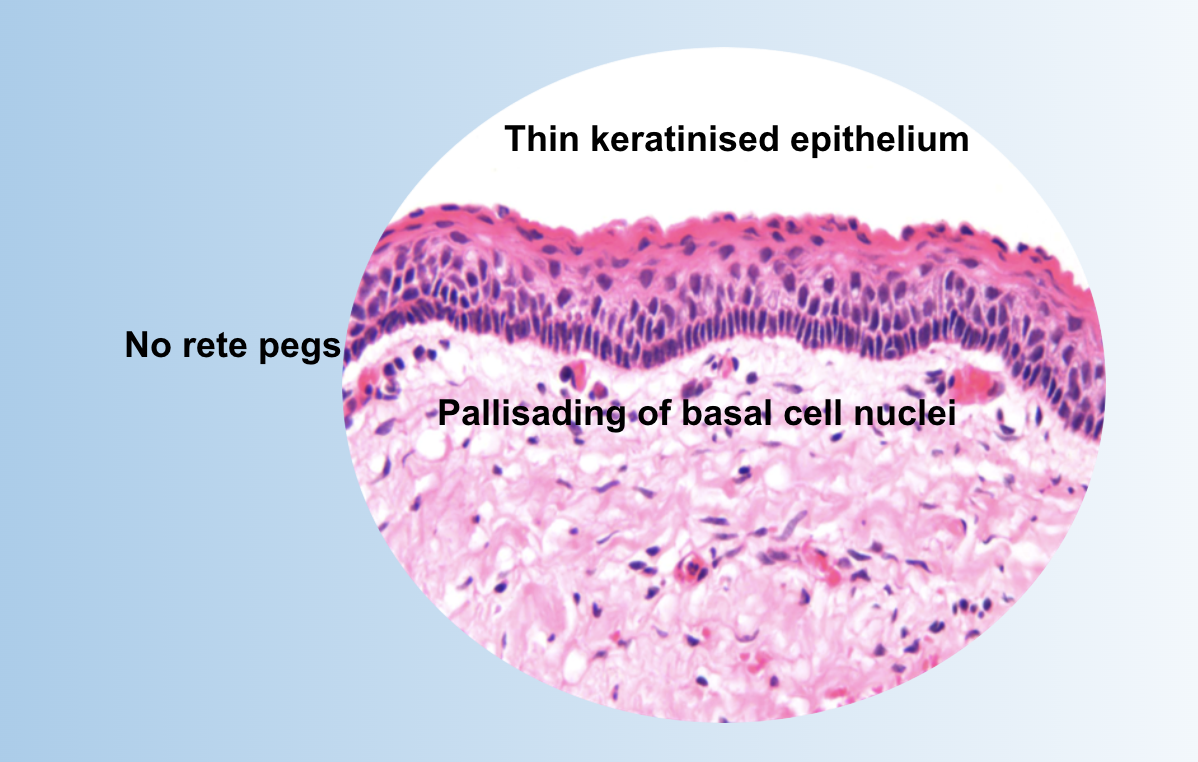 How do odontogenic keratocysts appear histologically?