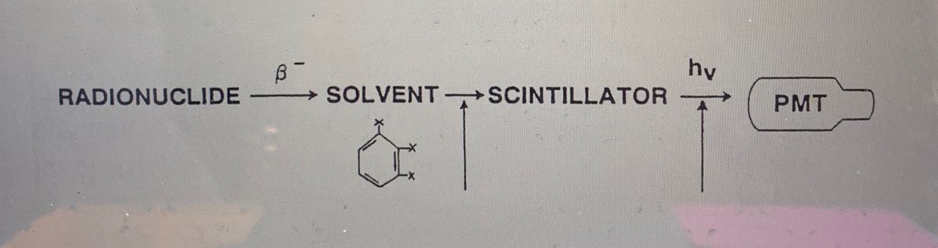 3) molécules de scintillant (excitées) redeviennent stables en émettant des photons (intensité proportionnelle à l’E de la particule bêta émise)