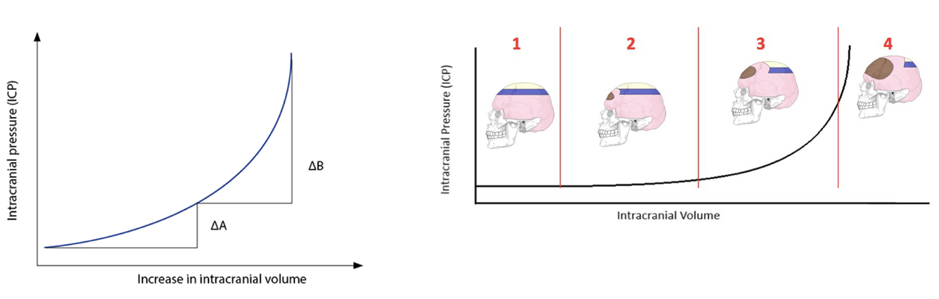 Intracranial volume rises gradually then rapidly to the point where the brain can b squeezed out of the foramen magnum