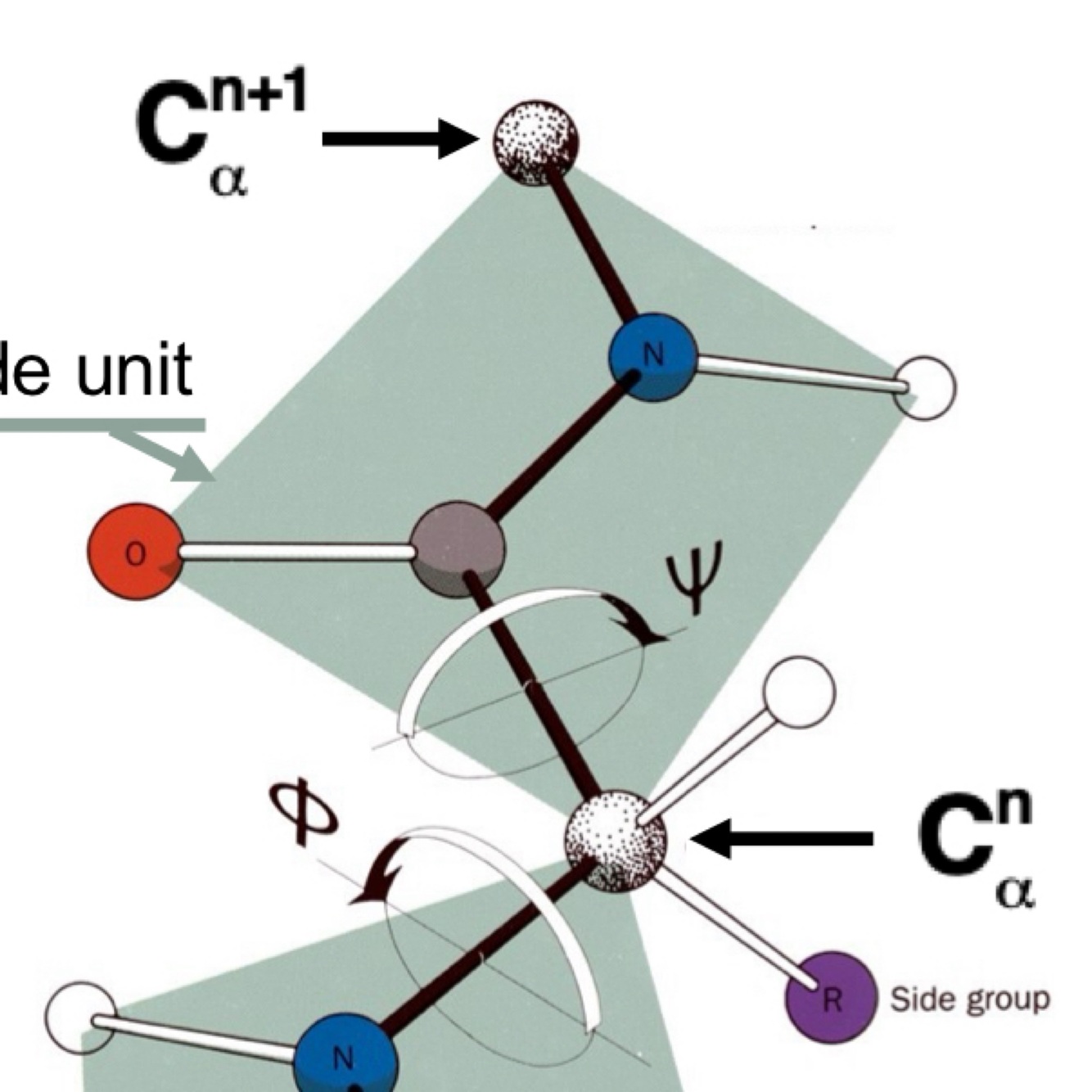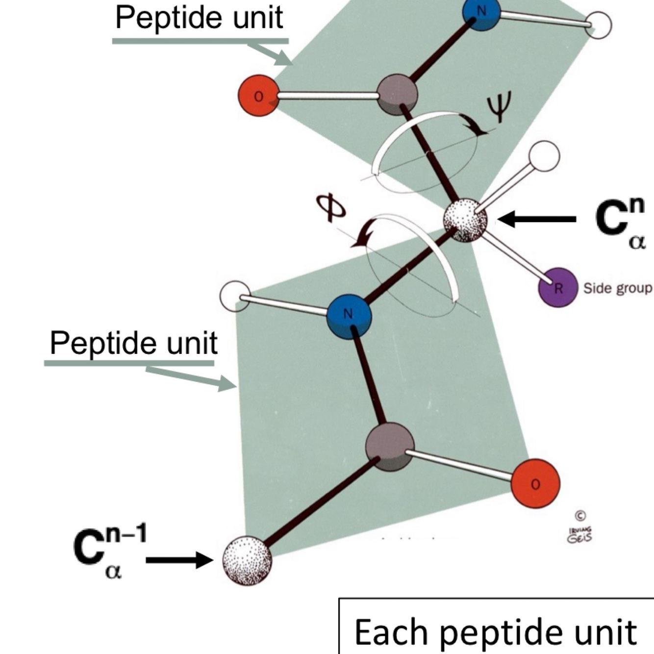 Two main chain torsional angle per residue: phi (circle with line) and psi (trident)
