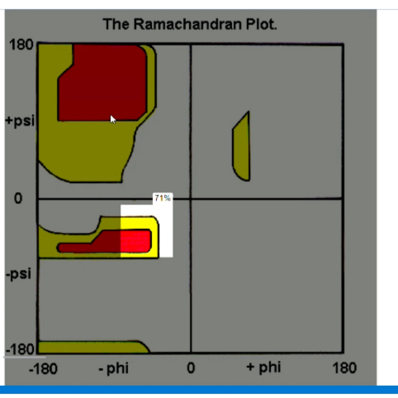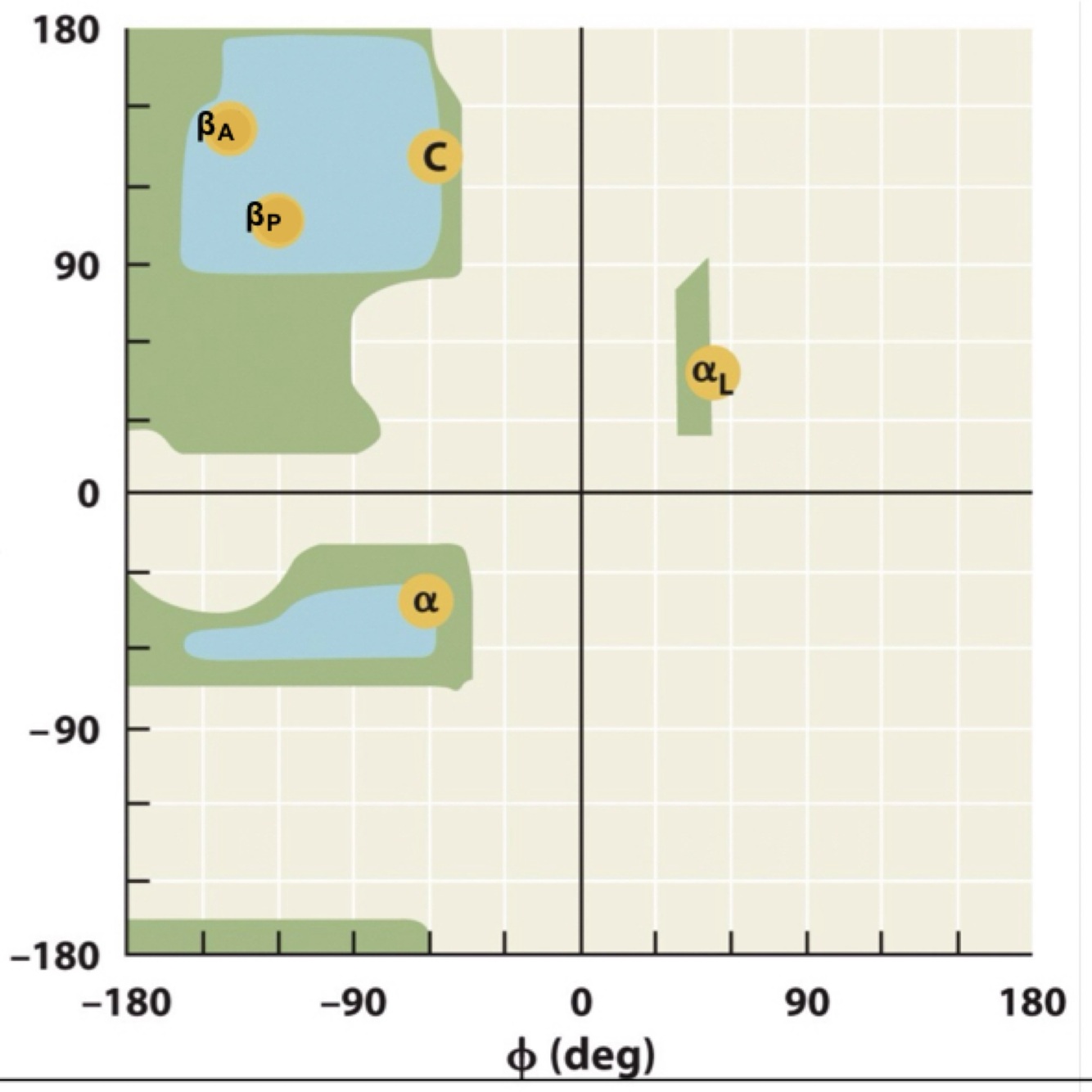 Not proline: has special circle side chain with amino group, much more restrictive confirmation criteria. (Least amount of regions allowed for torsion angle).