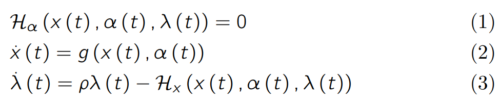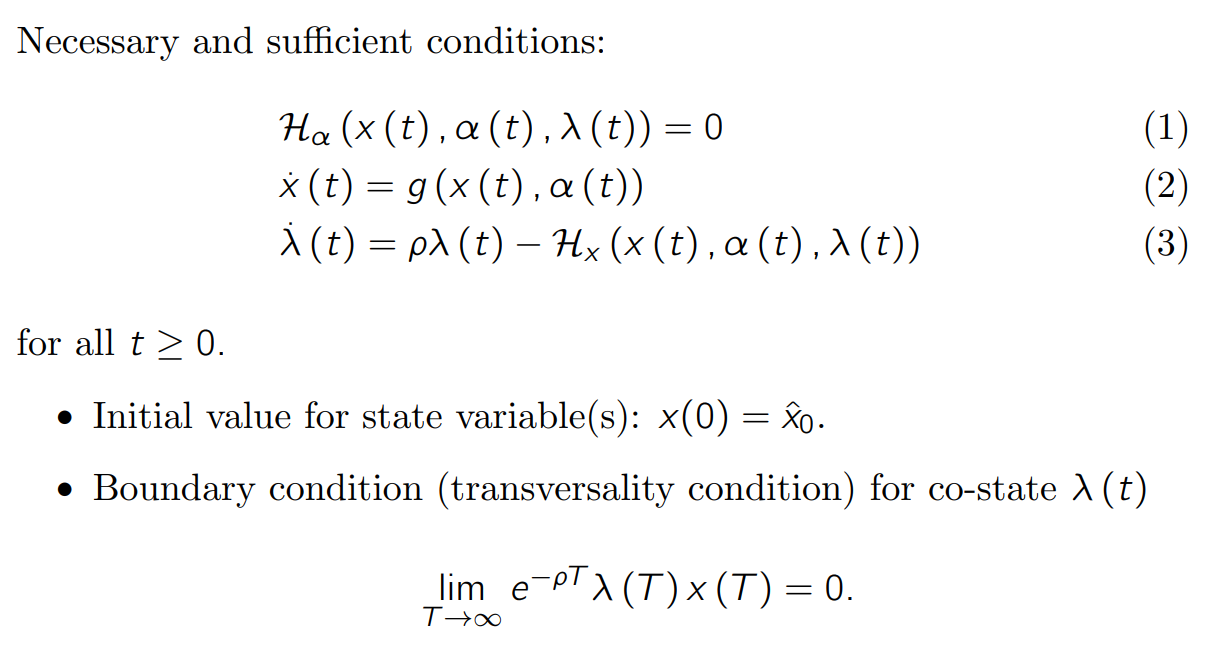+Write down the sufficient and necessary conditions to solve the continuous growth model using Hamiltonians