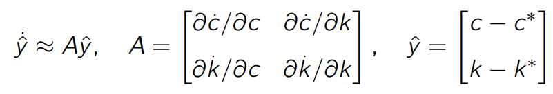 Given the continuous time growth model, give the equation of the first order approximation of the linearization around the steady state.