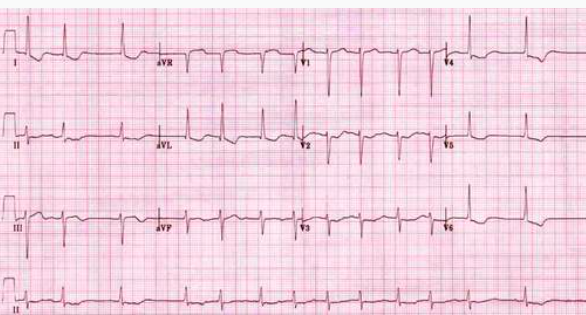 Cardiac tamponade occurs when a pericardial effusion causes haemodynamically significant cardiac compression. Signs include the classic beck’s triad which is comprise of; muffled heart sounds, low blood pressure and a raised JVP/distended neck veins. Another common finding is electrical alternans which is seen above, it is caused by the swinging of the heart in the pericardial fluid as it is being compressed. Common causes of pericardial tamponade include; following procedures such as post pacemaker implantation or post cardiac surgery, after trauma or due to a spontaneous bleed in anticoagulated patients